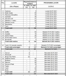 Come concordato con il personale incaricato, viste le previsioni meteo, in particolare per i giorni di lunedì e martedì, il cronoprogramma potrebbe subire delle variazioni, con spostamento degli interventi sotto il mercato coperto in via Verdi per la pioggia. In ogni caso, l’obiettivo resta quello di rifare tutti gli stalli blu.