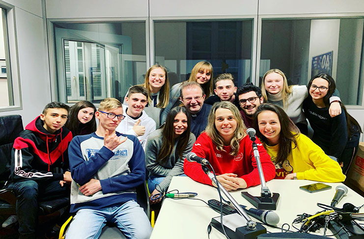 Don Lorenzo con alcuni giovani in redazione per un appuntamento della rubrica DonLorenzOnAir