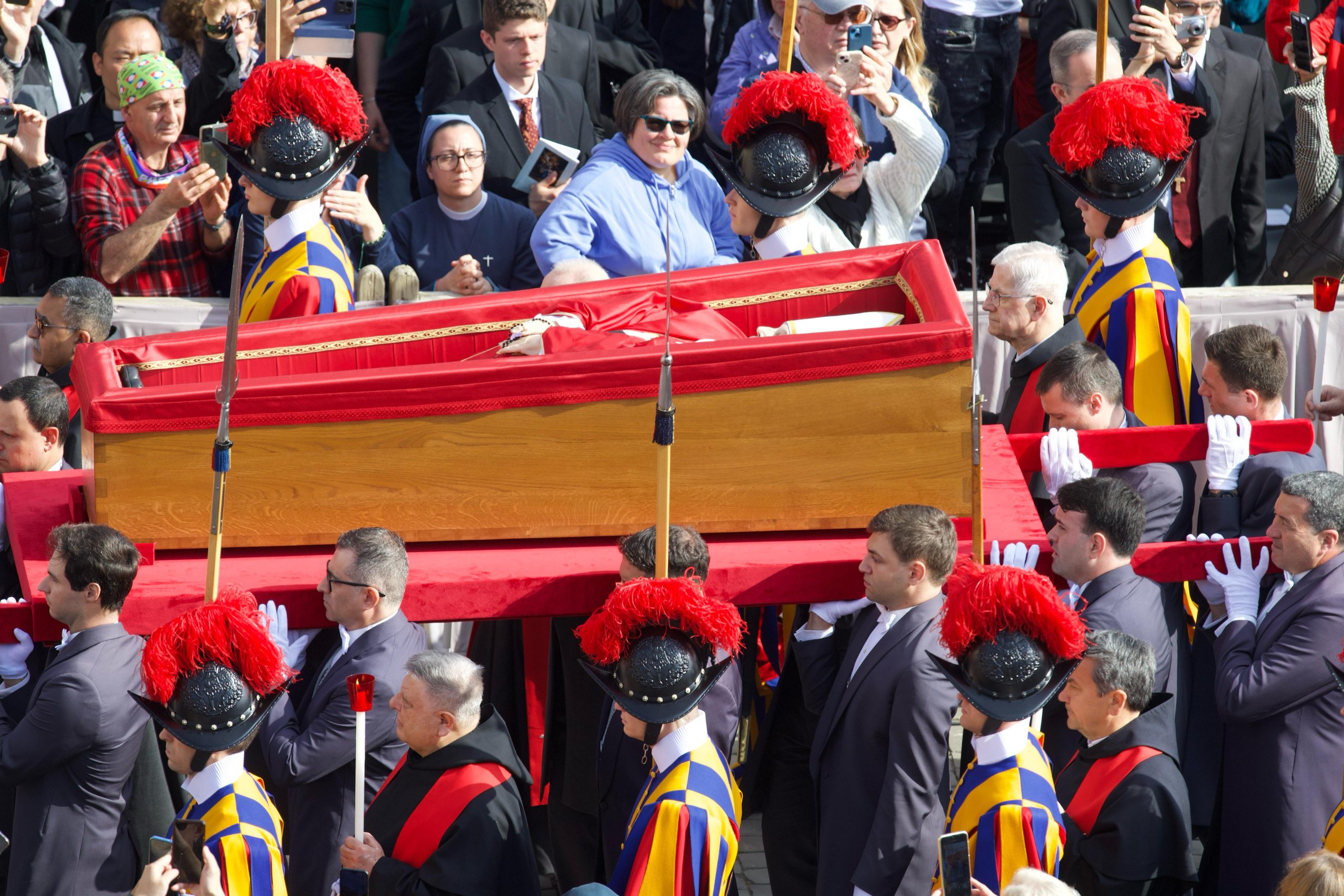 La bara aperta con il corpo di papa Francesco si trova ora nella basilica di San Pietro, ai piedi dell’altare della Confessione, grazie all’aiuto dei sediari pontifici che l’hanno deposta su un’apposita pedana leggermente sopraelevata, e non su un catafalco, come avveniva per gli altri Pontefici e come aveva disposto lo stesso Bergoglio, modificando l’“Ordo exsequiarum Romani Pontificis”. È l’ultimo atto del rito della traslazione della bara del Romano Pontefice, svoltosi questa mattina nell’orario previsto dal Collegio cardinalizio durante la prima Congregazione generale.