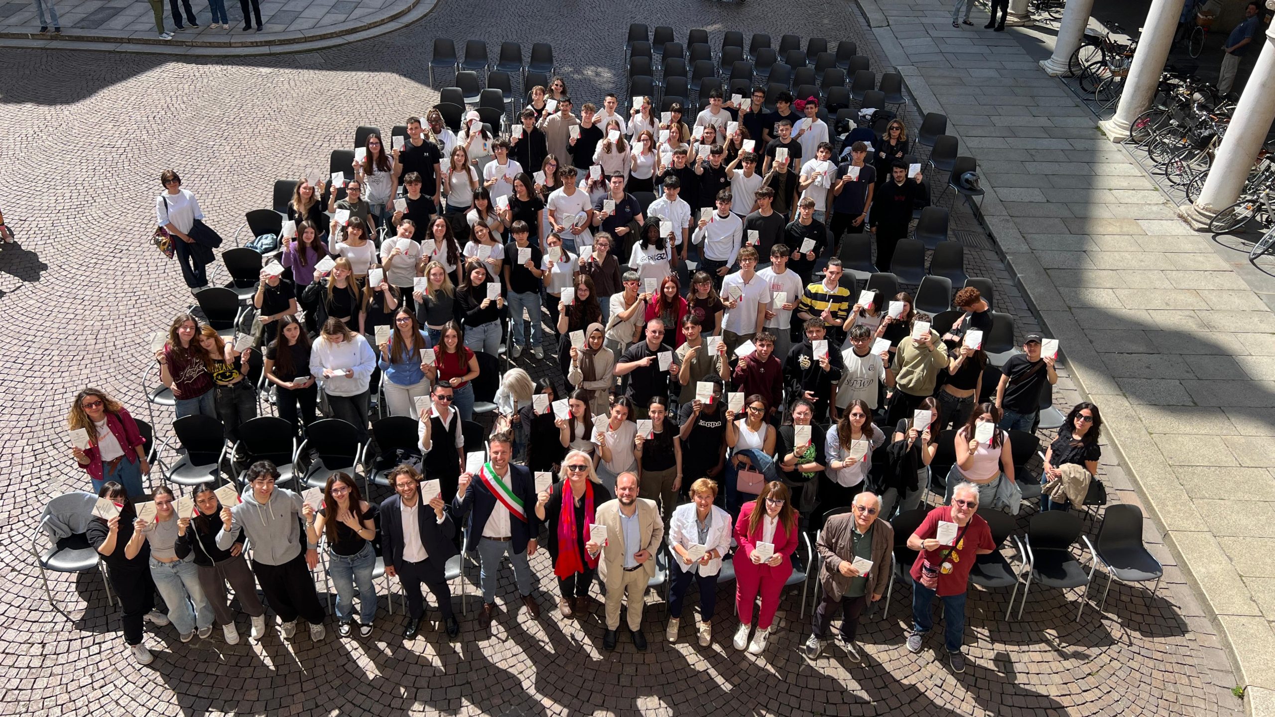 Il sindaco Fabio Bergamaschi, aprendo la cerimonia, ha voluto rivolgere un messaggio diretto ai giovani presenti: “Questa Costituzione che oggi vi consegniamo non è solo un simbolo: è una guida, una bussola etica e civile che vi accompagna nella costruzione del vostro futuro e in quello della nostra comunità. È il riconoscimento del vostro diritto a partecipare, a esprimervi, a contribuire con il vostro pensiero e le vostre azioni a una società più giusta e democratica. Una semplice cerimonia che speriamo vi lasci comunque qualcosa”. Al suo fianco la presidente del Comitato di promozione dei principi della Costituzione, prof.ssa Iris Campostori, che ha tenuto un discorso ai ragazzi. Sotto la torre pretoria, davanti ai 150 studenti erano presenti anche gli assessori della Giunta Giorgio Cardile ed Emanuela Nichetti, Paolo Balzari di Anpi e Martina Carioni, presidente della Consulta Giovani.